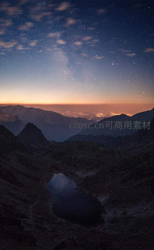 高海拔山谷中,平静湖面倒映着漫天星河与远方城市的点点灯火,展现天地交融的壮美景象。