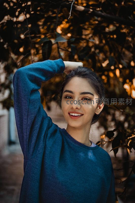 少女身穿蓝色卫衣,在温暖的阳光下对着镜头绽放灿烂笑容,背景树叶斑驳光影,充满青春活力与自然气息。