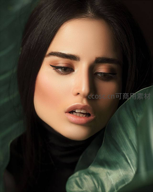女性面部特写,精致妆容与绿色叶片背景形成对比,眼线锐利,肌肤光泽细腻,整体画面充满时尚感与艺术气息,突出自然与美的融合。