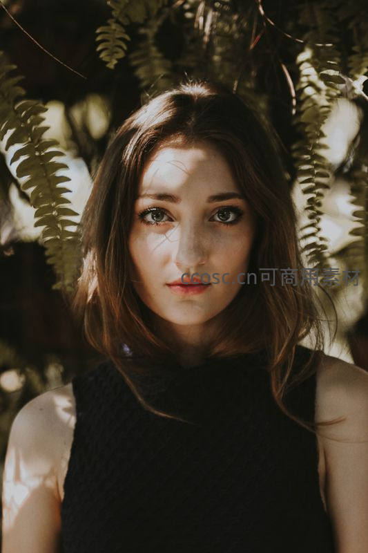 在茂密绿植的掩映下,阳光透过叶片洒在少女脸上,形成斑驳光影,她神情宁静,黑色上衣与绿色背景相得益彰,营造出静谧唯美的氛围。
