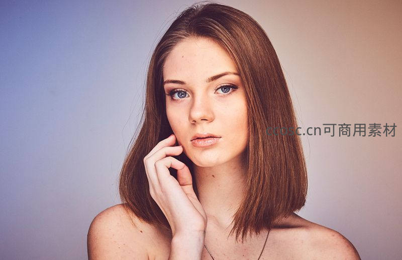 柔和渐变背景衬托下,少女轻抚脸颊,目光清澈,妆容精致却不张扬,散发出恬静温柔的气质,仿佛定格了青春最美好的瞬间。