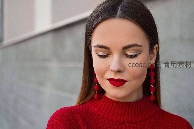 一位妆容精致的女子身着红色高领毛衣,佩戴同色系绒球耳环,低头若有所思,背景为现代建筑墙面,尽显都市女性魅力。