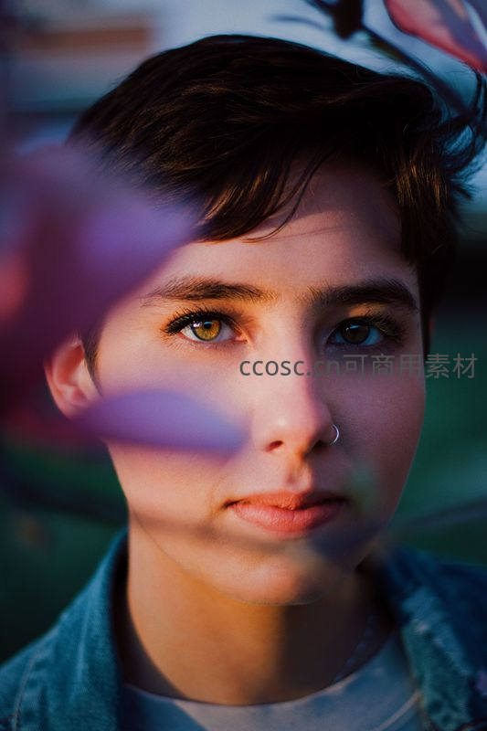 一位留着利落短发的青年直视镜头,鼻翼上的小环增添个性,前景模糊的紫色光影为其面部轮廓增添了梦幻的艺术氛围。