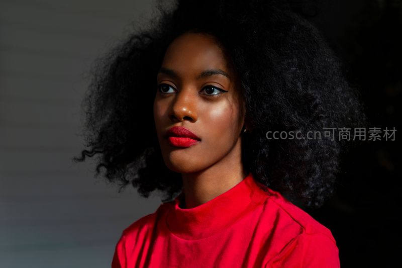 一位拥有蓬松黑色卷发的女性,身着鲜艳红色上衣,在柔和侧光下凝视镜头,展现出强烈的个性与时尚感。