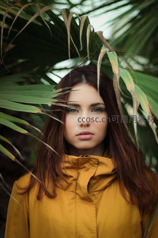 一位身穿亮黄色外套的年轻女性,在茂密的棕榈叶下凝视镜头,自然光线透过叶片洒落,营造出宁静而富有层次感的氛围。