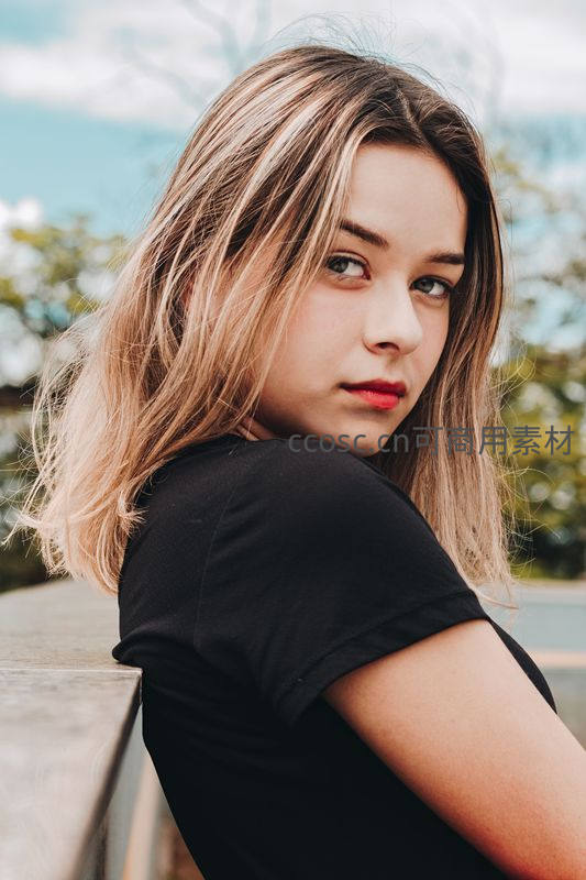 一位金发少女身穿黑色T恤,在户外阳光下回眸凝视镜头,背景绿意盎然,整体画面清新自然,充满青春活力。