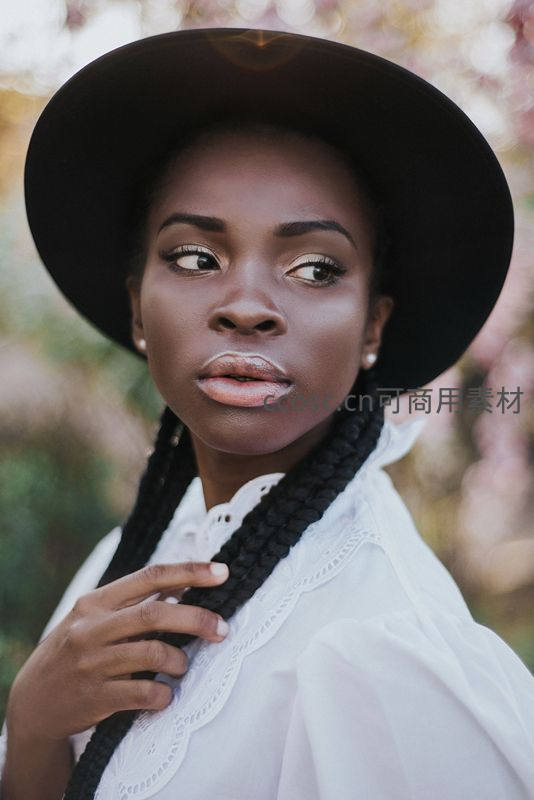 一位佩戴黑色宽檐帽的女性,身着白色蕾丝领衬衫,背景为柔和的自然光斑,展现出宁静而自信的气质。