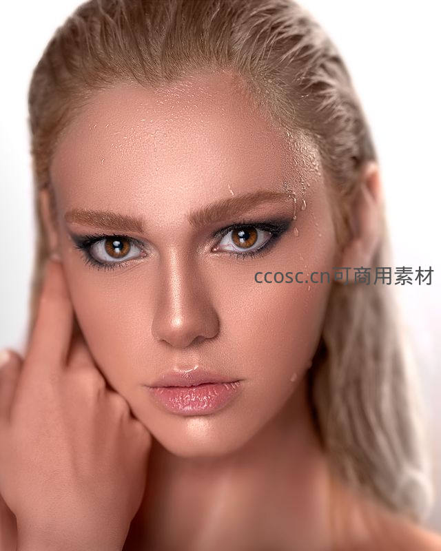 金发女性面部特写,妆容精致,水珠滑落脸颊,眼神深邃,手轻抚面颊,展现自然与人工美的结合。