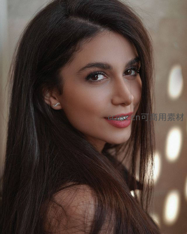 一位长发女性轻盈回眸,嘴角含笑,佩戴小巧耳钉,在温暖光斑映衬下尽显温柔与优雅,背景虚化突出主体神态。