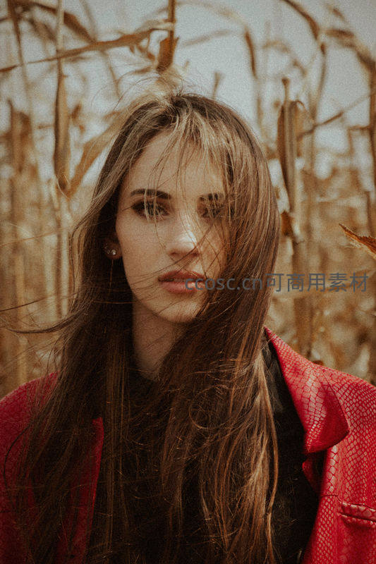金黄玉米田背景下,一位长发女子身着红色皮质外套,微风吹拂发丝,展现出自然野性与都市时尚交融的独特美感。