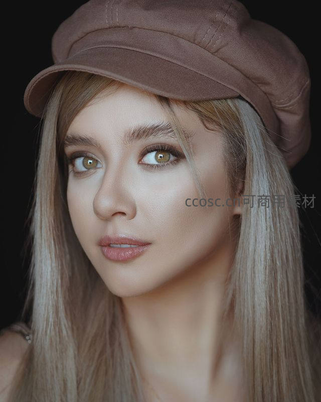 一位戴着棕色贝雷帽的金发女子,妆容清透自然,眼神温柔地直视镜头,背景为纯黑色,突出其面部轮廓与柔和气质,尽显法式优雅风格。