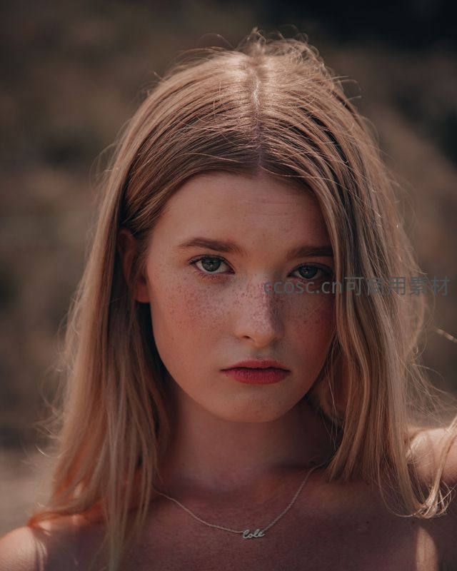 阳光下,一位拥有金色长发和可爱雀斑的少女直视镜头,佩戴简约项链,背景虚化,整体画面清新自然,充满青春活力。