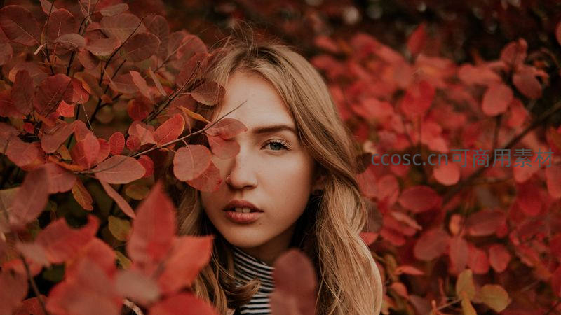金发少女置身于一片火红的秋叶丛中,眼神清澈而宁静,微风轻拂发丝,营造出一种诗意浪漫的氛围,展现了人与自然和谐共生的美感。