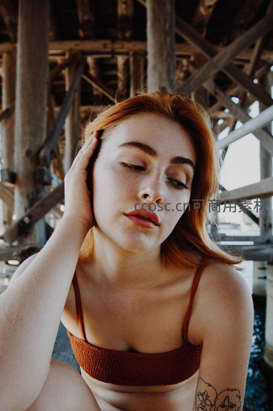 红发女子在木结构桥下闭目养神,阳光洒落肩头,手臂上的纹身若隐若现,营造出宁静又略带文艺气息的午后氛围。