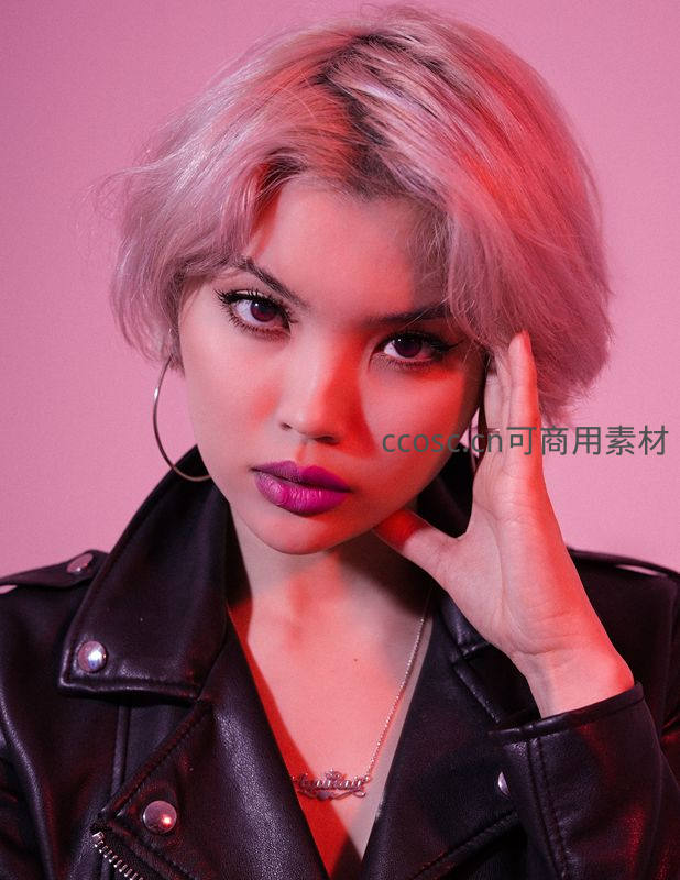 在梦幻粉红色灯光映衬下,短发女孩身穿黑色皮夹克,妆容精致,眼神锐利,手轻触脸颊,散发强烈的个性与潮流感。