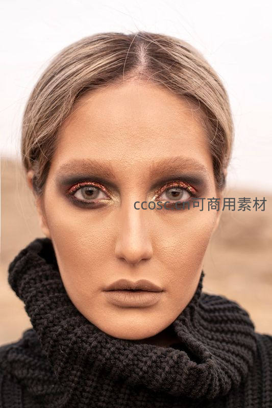 模特在户外自然光下展示华丽眼妆,金色亮片与深色眼影形成强烈对比,搭配高领针织衫,营造出冷艳又温暖的视觉氛围。