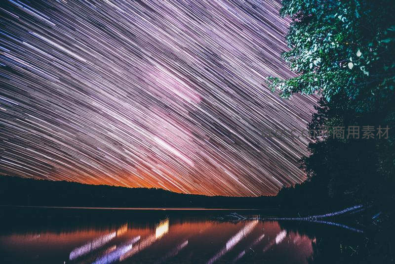 长时间曝光捕捉到旋转的星轨如彩色瀑布般倾泻而下,湖面倒影与岸边绿树共同构成梦幻画卷。