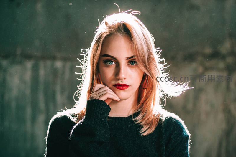 在斑驳墙面背景下,红唇少女逆光而立,手托下巴若有所思,发丝被光线勾勒出轮廓,整体画面充满复古文艺气息与个性张力。