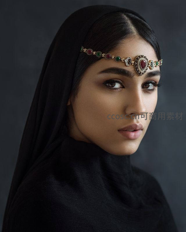 一位身着黑色头纱、佩戴华丽宝石头饰的女性,眼神深邃而宁静,展现了浓郁的异域文化与古典美感。