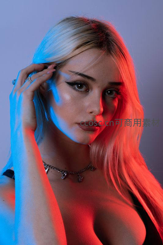 在强烈的红蓝霓虹灯光下,金发女子以精致妆容和冷艳神情直视镜头,散发出未来感十足的潮流与性感魅力。
