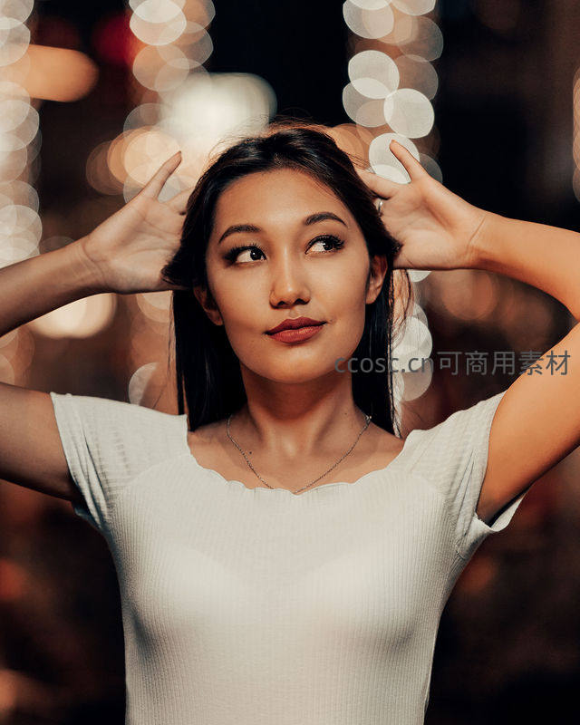 年轻女子在梦幻般的散景灯光背景下,双手举过头顶做出可爱的角形手势,面带微笑望向一侧,整体画面充满活力与节庆感。