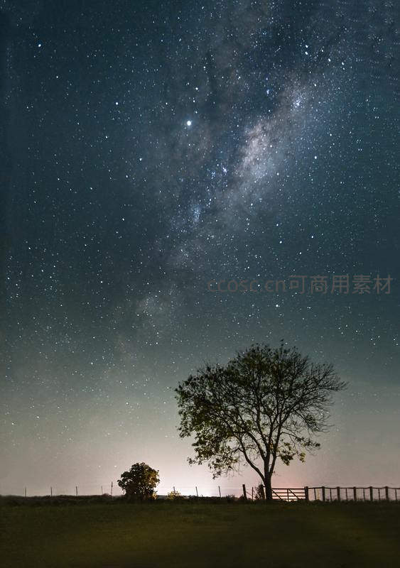 广袤田野上一棵孤树剪影,在浩瀚银河的映衬下显得格外宁静,远处微光点缀着乡野的夜晚。