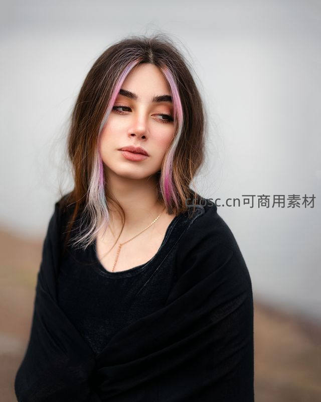 一位拥有棕色长发并带有醒目粉紫色挑染的少女,身穿黑色宽松上衣,佩戴细金项链,眼神低垂略带忧郁,背景模糊,营造出宁静而富有情感的氛围。