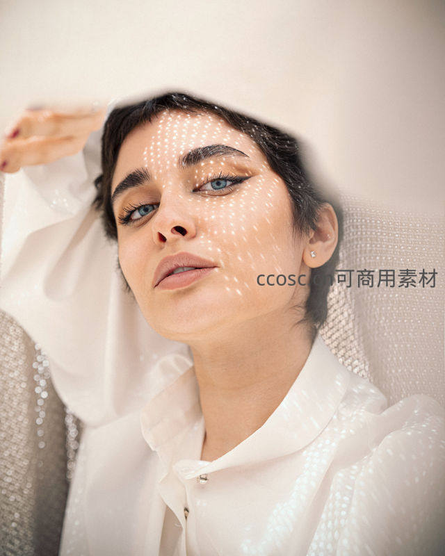 一位留着利落短发的女子,身着白色衬衫,躺在浅色沙发上,阳光透过百叶窗在她脸上投下斑驳的光点,蓝色眼眸凝视前方,姿态慵懒而充满艺术感。