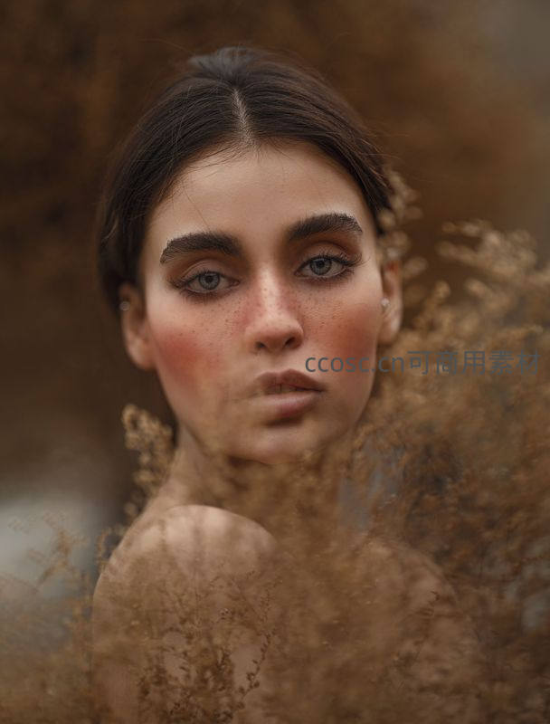 一位脸上带着可爱雀斑的少女,裸露双肩,置身于一片金黄色的干草丛中,柔和的光线勾勒出她的轮廓,眼神清澈而坚定,散发出自然与野性的美感。