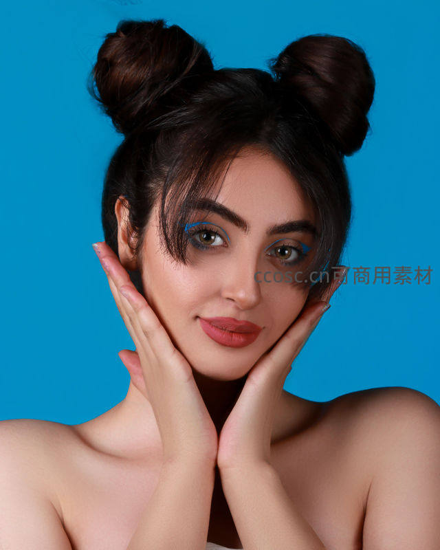 一位年轻女性以俏皮的双丸子头发型出镜,搭配鲜艳蓝色眼妆,在纯蓝背景下双手托腮,展现出青春活力与时尚感。