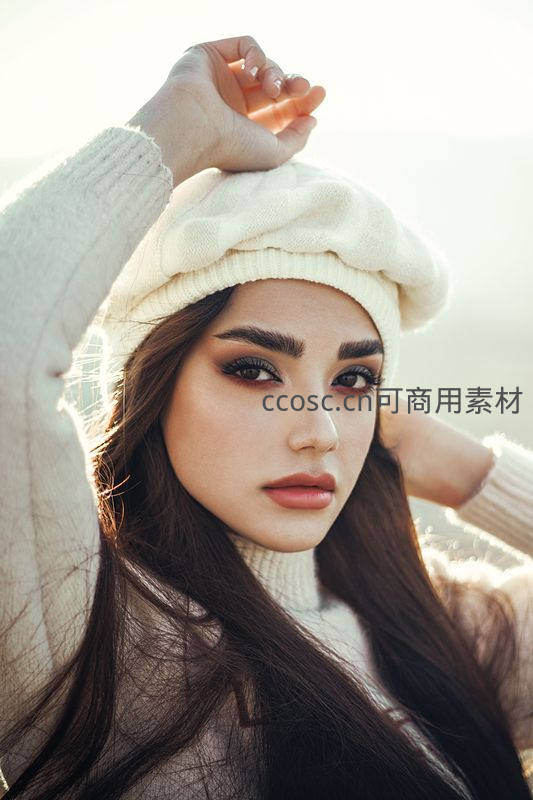 暖阳下,女子戴着米白色贝雷帽,精致妆容与柔顺长发相得益彰,手轻抚帽檐,散发出温暖、优雅且充满活力的冬日气息。
