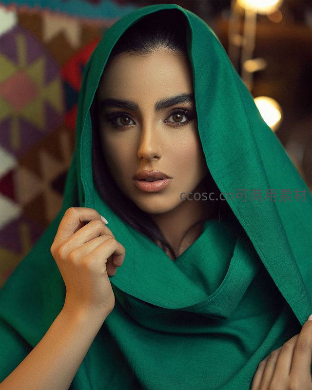 女子身披翠绿丝巾半遮面容,浓眉大眼搭配精致妆容,背景民族图案与暖光营造出浓郁异域氛围,尽显神秘优雅气质。
