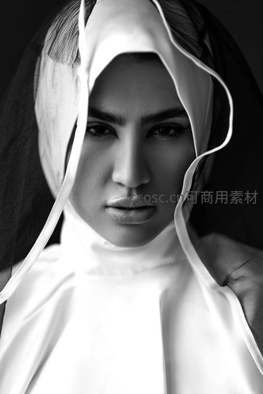 一位女性身着白色修女服,黑色面纱半遮面容,在纯黑背景下凝视镜头,光影对比强烈,营造出神秘而庄重的氛围。