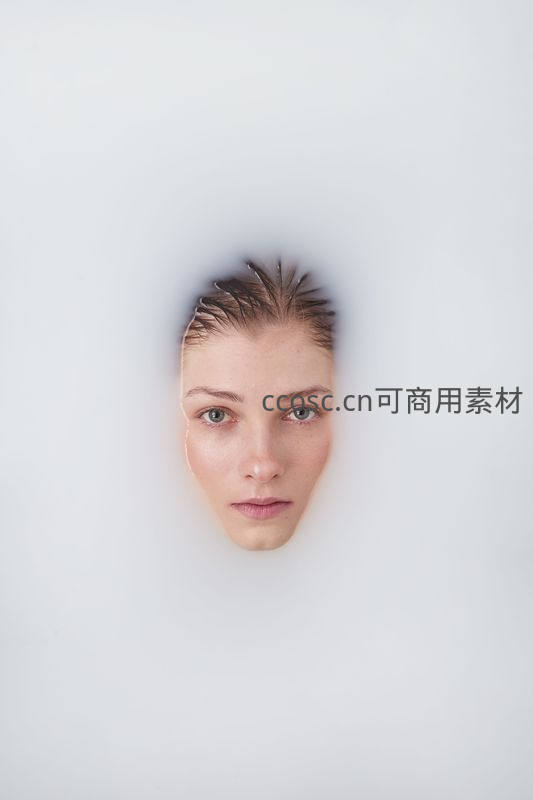 一张年轻女性的脸从纯白的牛奶中浮现,湿润的发丝紧贴额头,清澈的眼神直视前方,画面纯净而富有视觉冲击力。