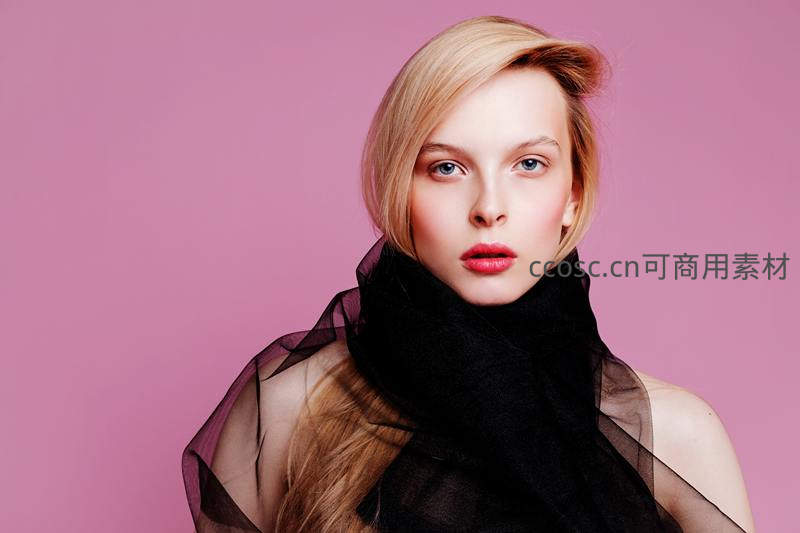 一位金发女性身着黑色薄纱围巾,在柔和的粉色背景下展现出优雅与神秘感,妆容精致,眼神深邃。