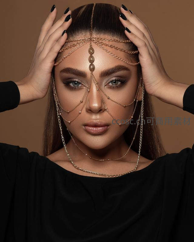 模特佩戴复杂金色面部链饰,双手轻抚发际,妆容精致立体,黑色服装衬托金属光泽,呈现前卫时尚与神秘异域的艺术美感。