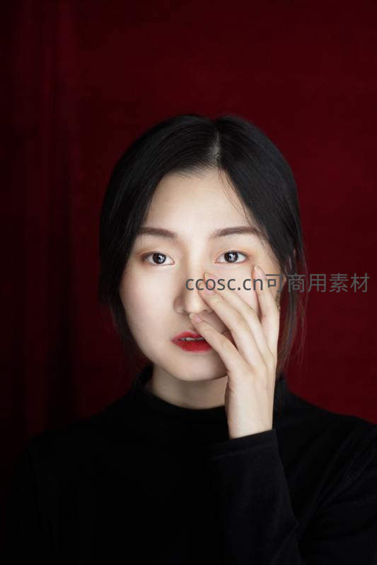 一位黑发女子在深红色背景前,身着黑色高领上衣,以手指轻触鼻尖,眼神平静而专注,营造出一种内敛而富有故事感的氛围。