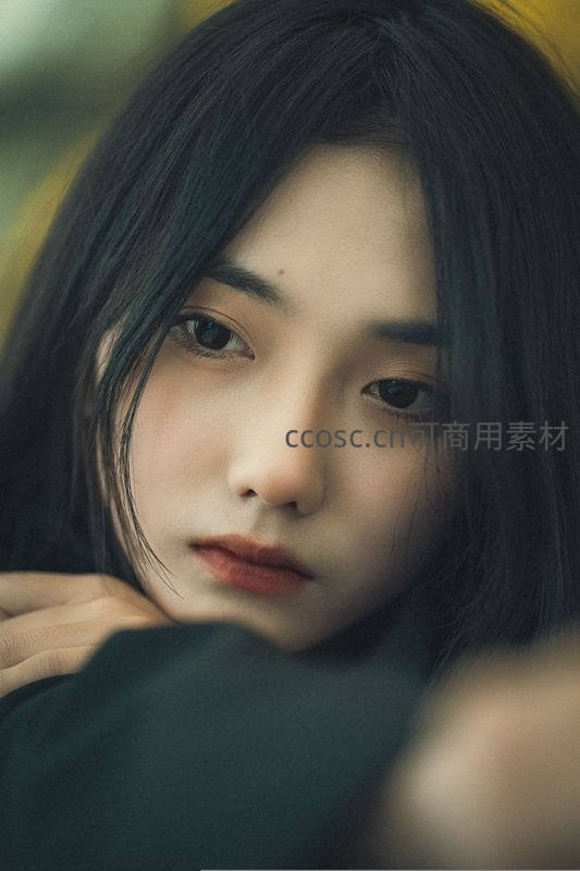 黑发少女以沉静目光直视镜头,背景虚化营造梦幻氛围,微红唇色与清冷肤色形成对比,传递内敛而富有故事感的情绪。