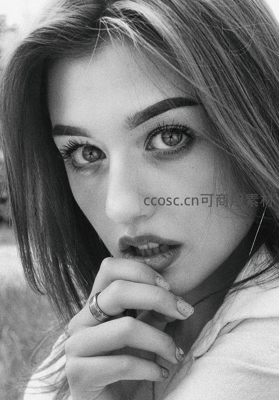这是一张经典的黑白人像特写,女孩手托下巴,眼神迷离而深邃,搭配精致的美甲和戒指,传递出一种复古、内省且富有故事感的情绪。