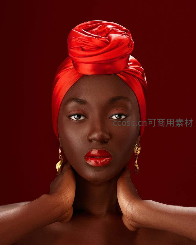 一位深肤色女性佩戴鲜艳红色头巾与金色耳环,双手轻托下巴,眼神坚定而温柔,展现独特的时尚魅力与文化自信。