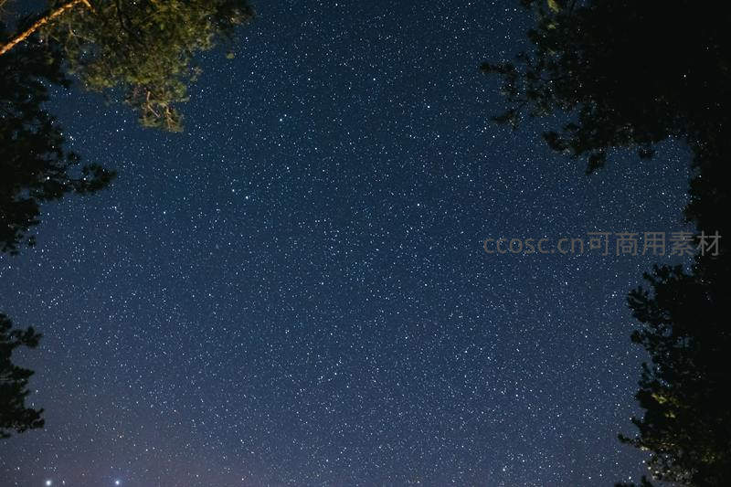 深蓝色的夜空中布满繁星,树冠在画面边缘形成天然画框,营造出静谧而神秘的观星氛围。