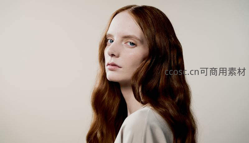 一位拥有柔顺红发的年轻女性,以优雅的侧脸姿态凝视镜头,背景纯净简洁,突显其清冷而沉静的气质。