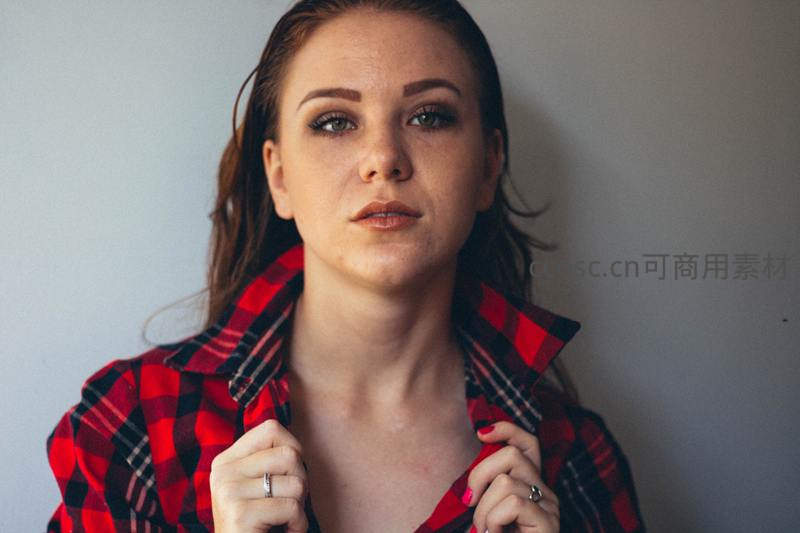 一位年轻女性身着经典红黑格子衬衫,双手轻拉衣领,眼神直视镜头,展现出自信与沉静的气质,背景简洁突出主体。