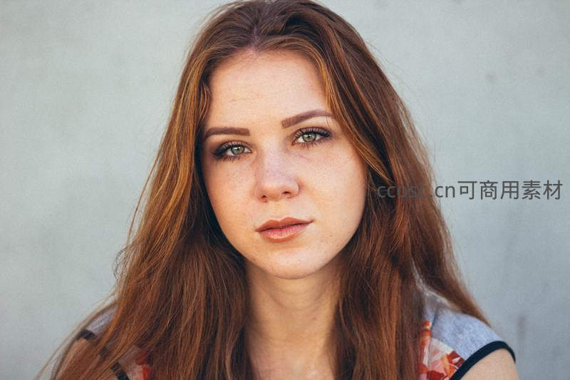 画面捕捉一位红棕色长发女子的面部特写,她素颜直视镜头,表情平静自然,光线柔和,营造出清新、真实的视觉感受。