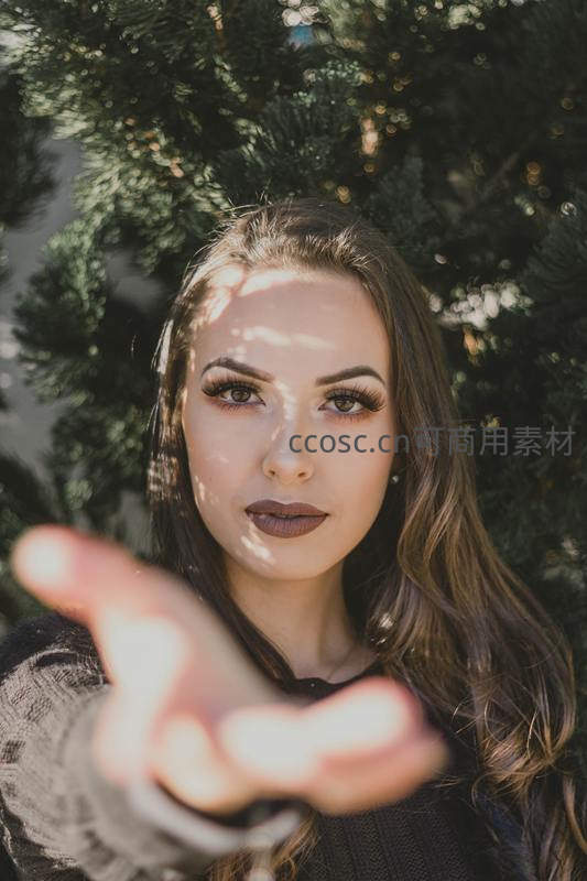 一位女性在树影斑驳的阳光下,眼神温柔地注视着镜头,伸出的手掌仿佛在邀请观众进入她的世界,背景的绿叶增添了宁静的氛围。