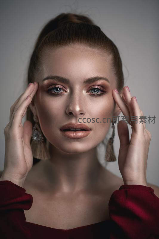 一位妆容精致的女性双手轻触脸颊,眼神专注而温柔,搭配复古流苏耳环与酒红色上衣,尽显高贵典雅的时尚魅力。