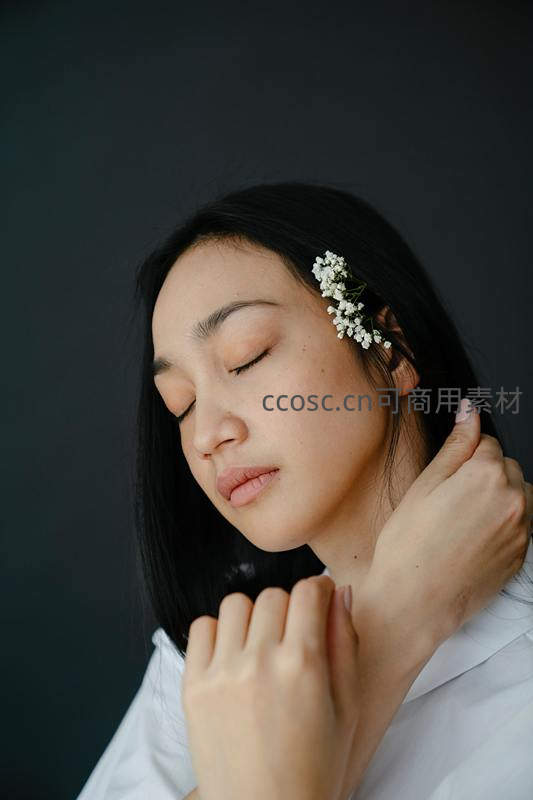 一位黑发女子闭目沉思,耳畔别着一簇洁白的小花,双手轻抚颈部,纯白衬衫与深色背景形成对比,营造出宁静致远的诗意画面。