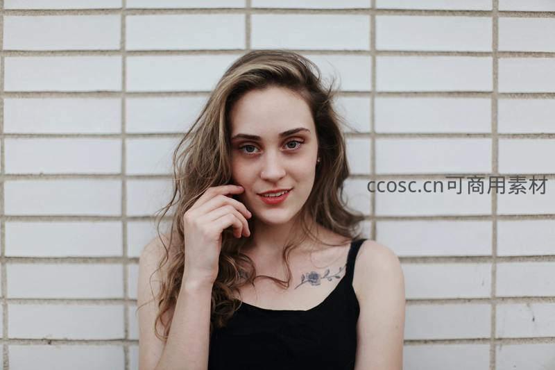 一位拥有柔顺卷发的年轻女子站在白色砖墙前,面带浅笑,颈部有精致纹身,穿着黑色吊带上衣,展现出随性又清新的气质。