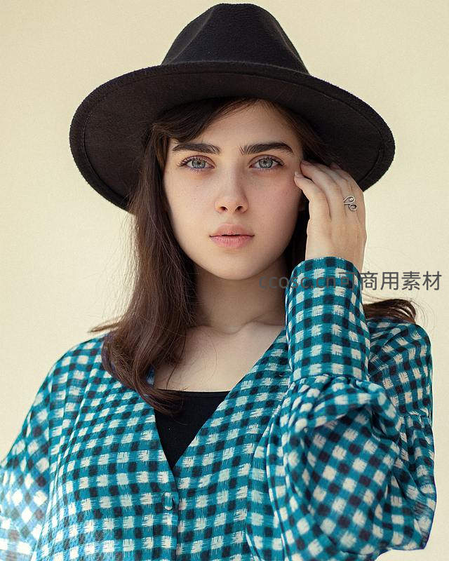一位年轻女性头戴黑色宽檐帽,身穿蓝白格纹衬衫,手轻触脸颊,眼神清澈直视镜头,背景简洁,凸显其时尚与沉静气质。