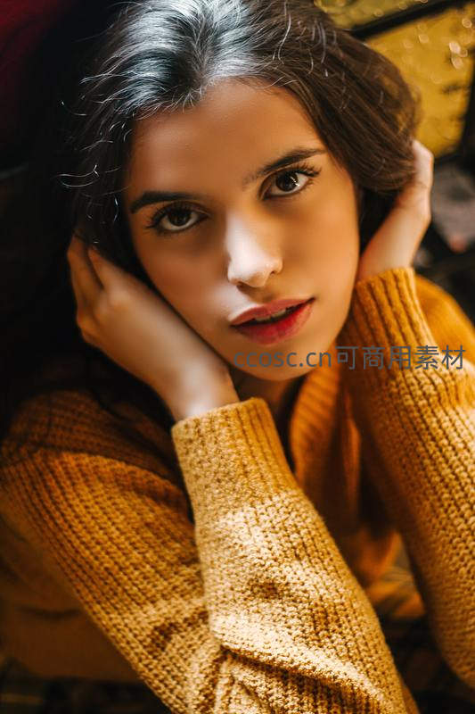 女子双手轻托脸颊,眼神深邃,身穿米黄色针织衫,背景虚化突出主体,整体画面充满安静与思考的氛围。